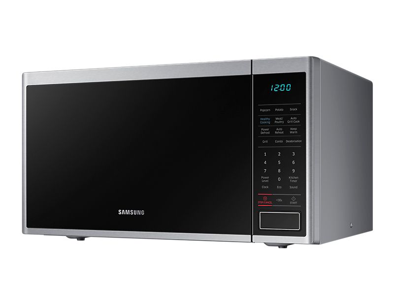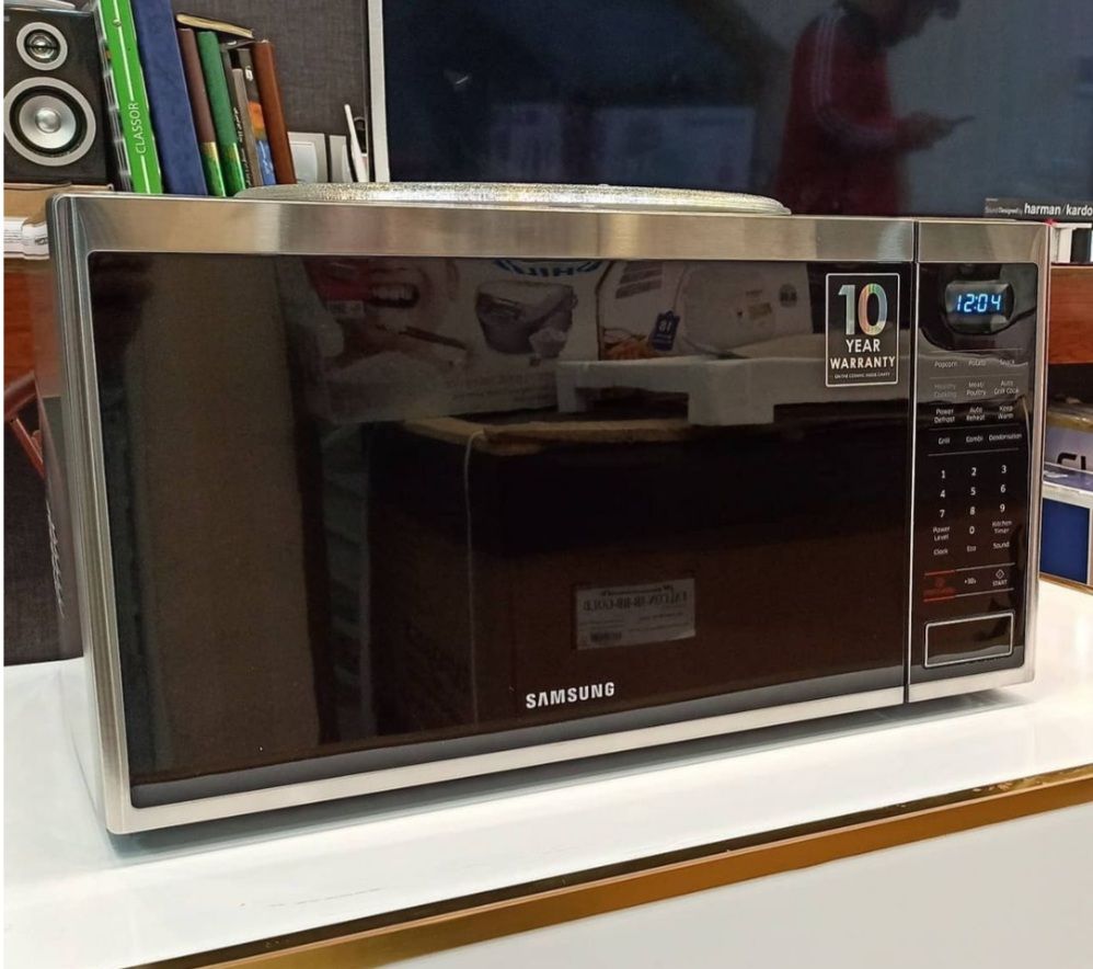 مایکروویو سامسونگ مدل MG40J5133AT یکی از بهترین مایکروفر های تولیدی برند سامسونگ میباشد. این ماکرو دارای ظرفیت ۴۰ لیتر است و فضای خوبی را برای پخت و پز غذا در اختیار شما میگذارد. بدنه دستگاه به رنگ مشکی و نقره ای میباشد و نمای بسیار زیبایی دارد. این مایکروفر خوش ساخت سامسونگ با قیمت مناسبی که دارد گزینه ای عالی برای خرید میباشد. ابعاد و اندازه بسیار مناسب مایکرو طوری است که به راحتی روی کابینت جای میگیرد و وزنی بالغ بر ۱۷ کیلوگرم دارد. در این مطلب برای شما توضیحاتی در مورد مشخصات دستگاه و نیز نحوه خرید و قیمت مایکروویو سامسونگ مدل ۵۱۳۳ ارائه میدهیم. با ما همراه باشید.رنگ بندی زیبای این محصول به گونه ای است که به راحتی با لوازم آشپزخانه شما ست و هماهنگ میشود. از مشخصات ظاهری دیگر مایکروویو ۴۰ لیتری سامسیونگ مدل ۵۱۳۳ میتوان به درب بزرگ مشکی رنگ آن اشاره کرد که با فشار یک دکمه به داخل باز میشود. صفحه نمایش دستگاه در قسمت راست محصول قرار دارد و دارای تنظیماتی میباشد. تعدادی برنامه نیز جهت پخت مواد غذایی از کاراریی های مهم این ماکروفر خوش ساخت است.ظرفیت در ماکروویو از مهمترین موارد در خرید ماکرو است که باید در نظر داشت. یکی از ویژگی های این دستگاه توان ۹۰۰ واتی آن است که نیروی خوبی را برای انتقال گرما به مواد غذایی ایجاد میکند. همچنین قابلیت گریل هم از دیگر امکانات این ماکروفر است که قدرتی ۱۵۰۰ واتی دارد. سیستم یخزدایی و ذوب مواد یخ زده هم ویژگی بارز این ماکروفر است.